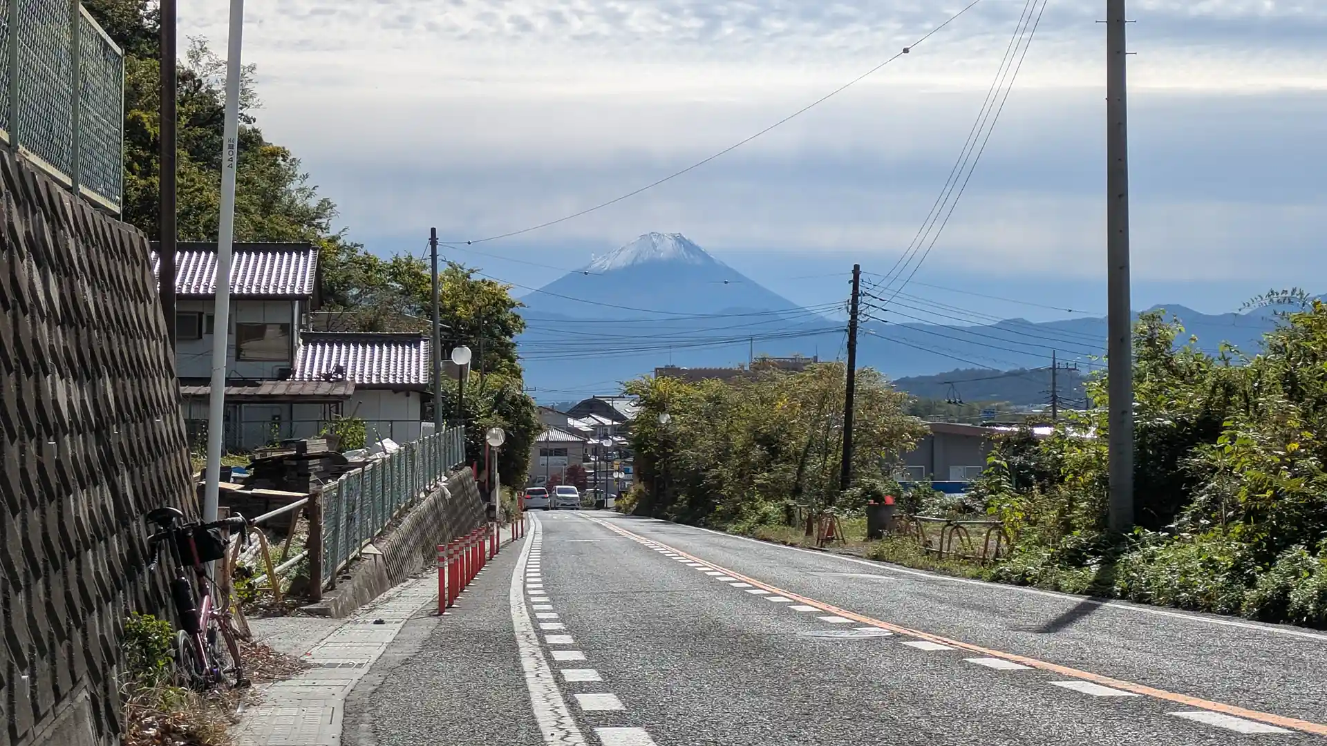 韮崎宿から甲府柳町宿までは14kmほどの距離で、進行方向に常に富士山が見えるので映える景色が撮れる。