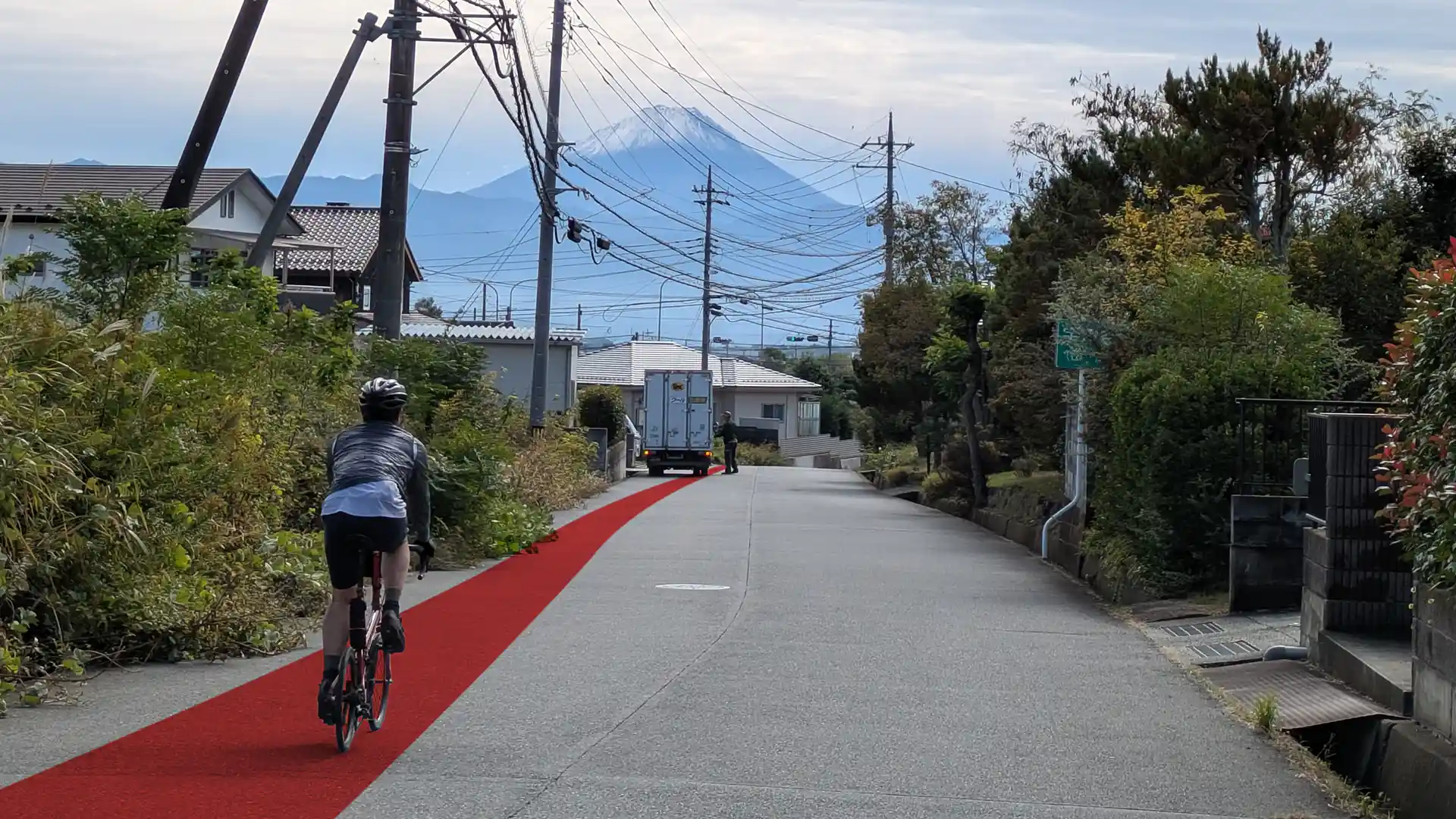 キャンプ場から韮崎中央公園までクルマで移動していざ出発。まずは韮崎宿本陣跡の石碑に向かう。途中、七里岩ラインを下っていると正面に富士山が!