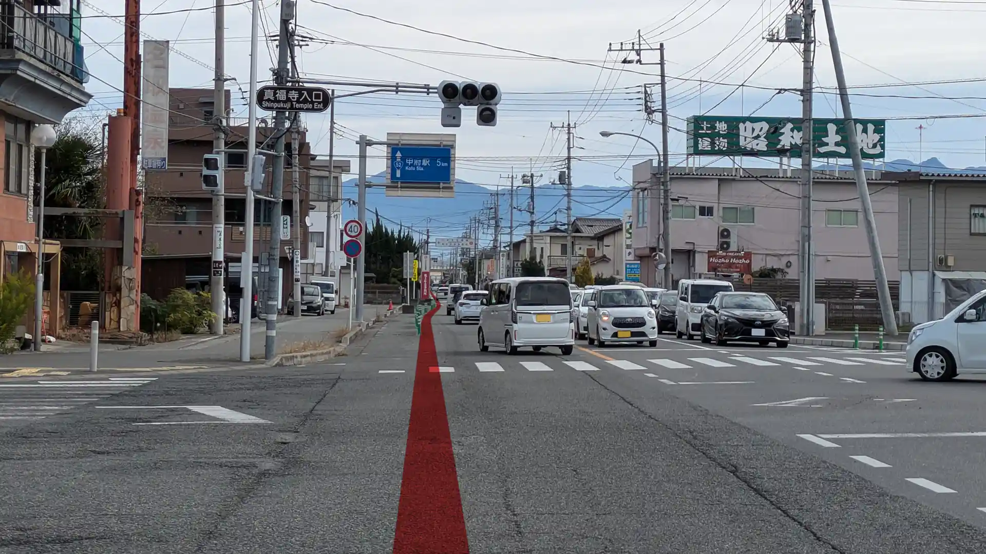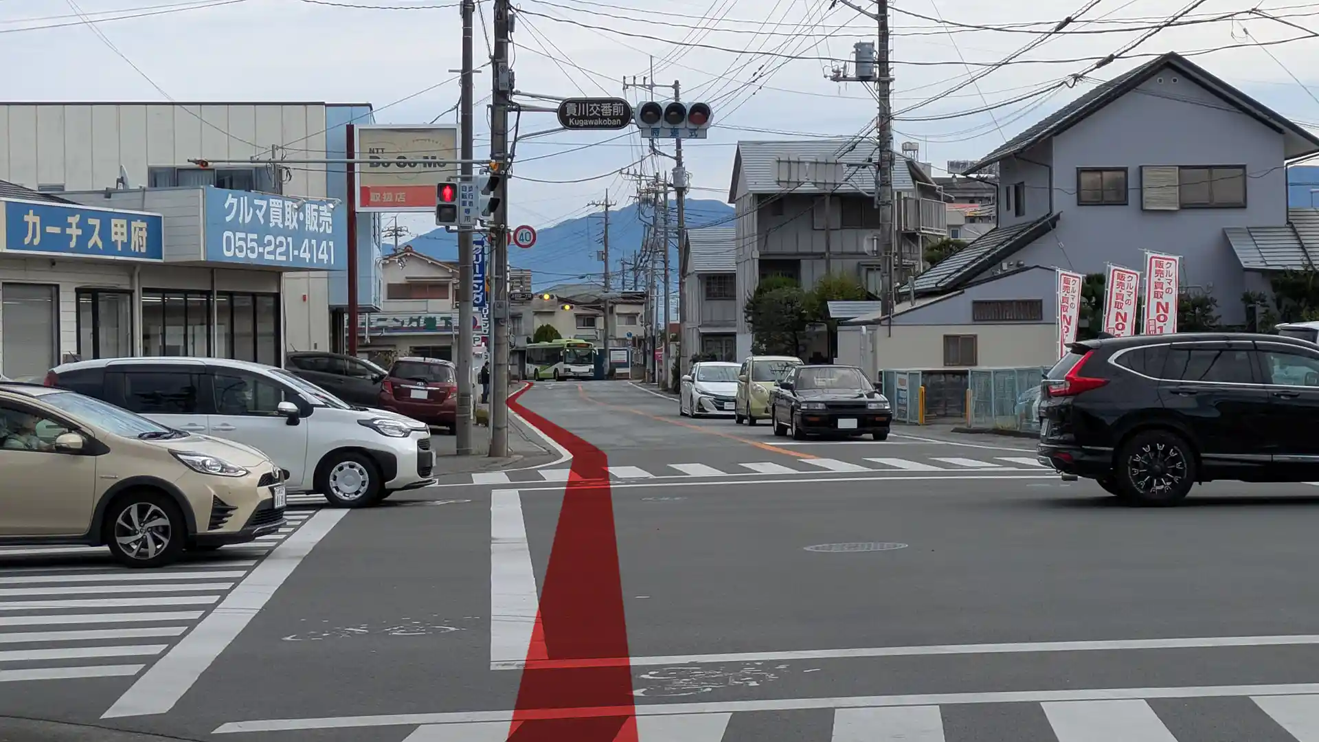 踏切の後、甲州道中(旧甲州街道)は国道52号線と144号線となり、賑やかな市街地を通過していく。