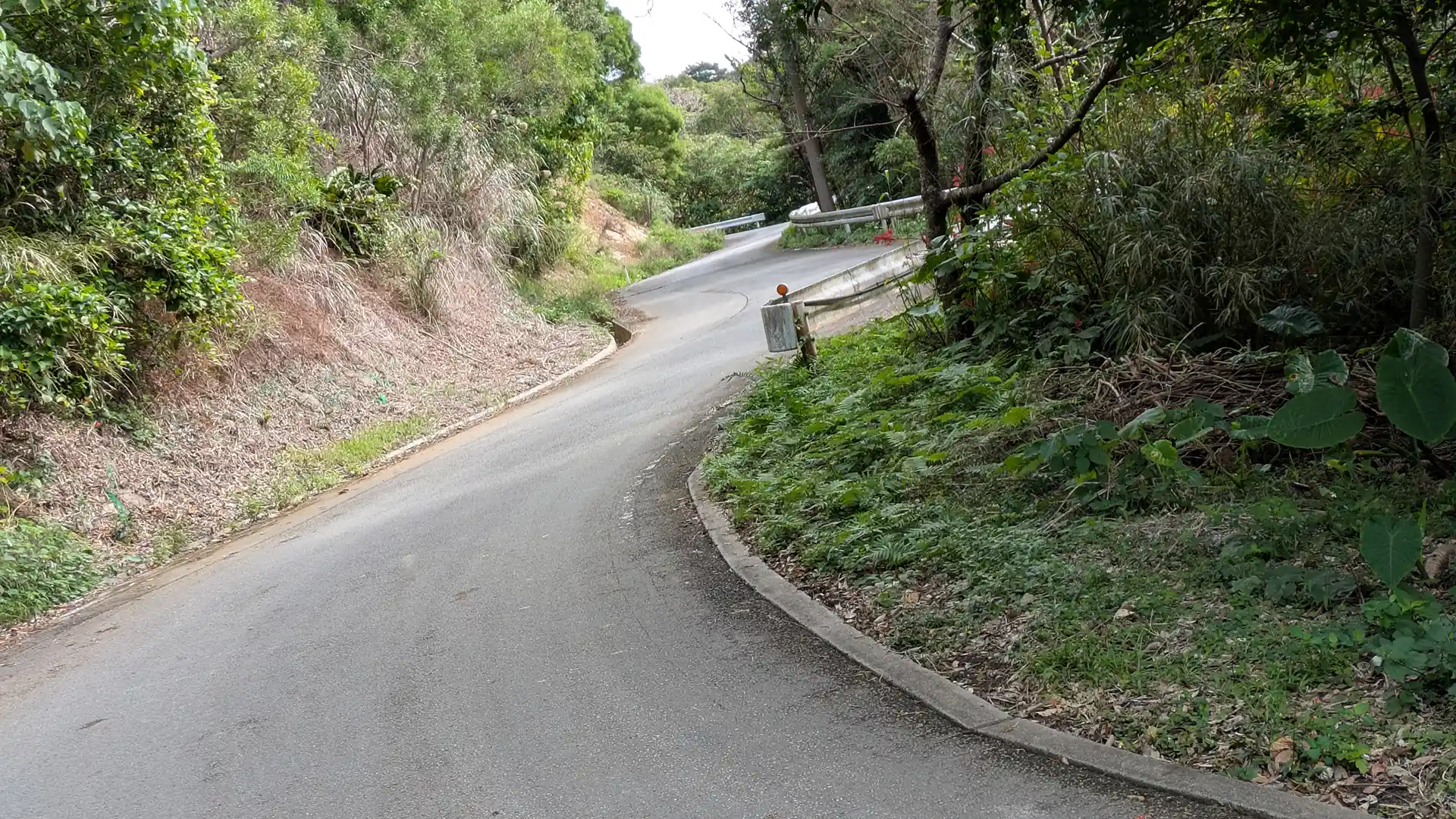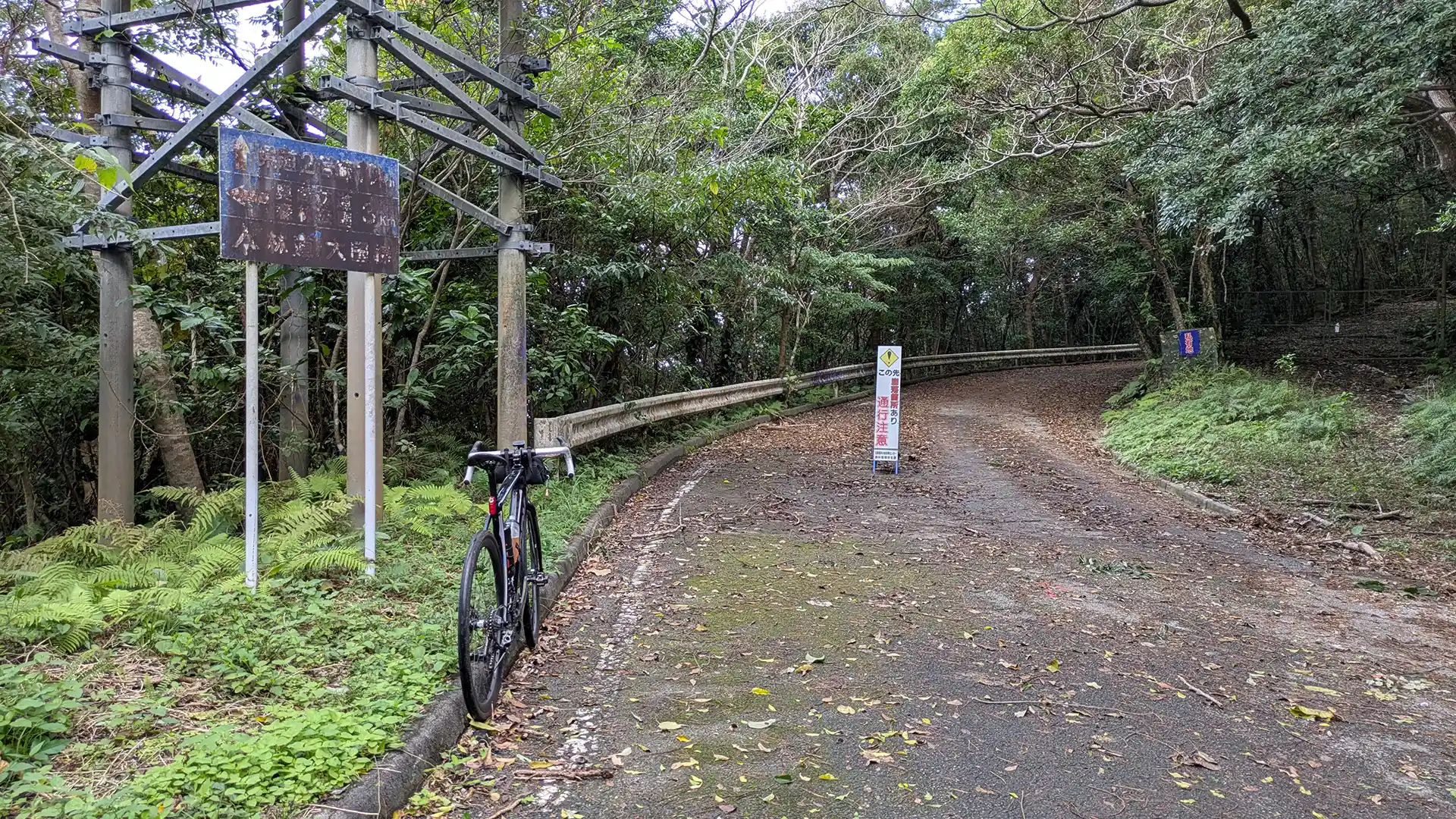 伊地林道の起点に到着。水はけ用なのかバンプがあった。速度を落とさないとこちらも落車する。