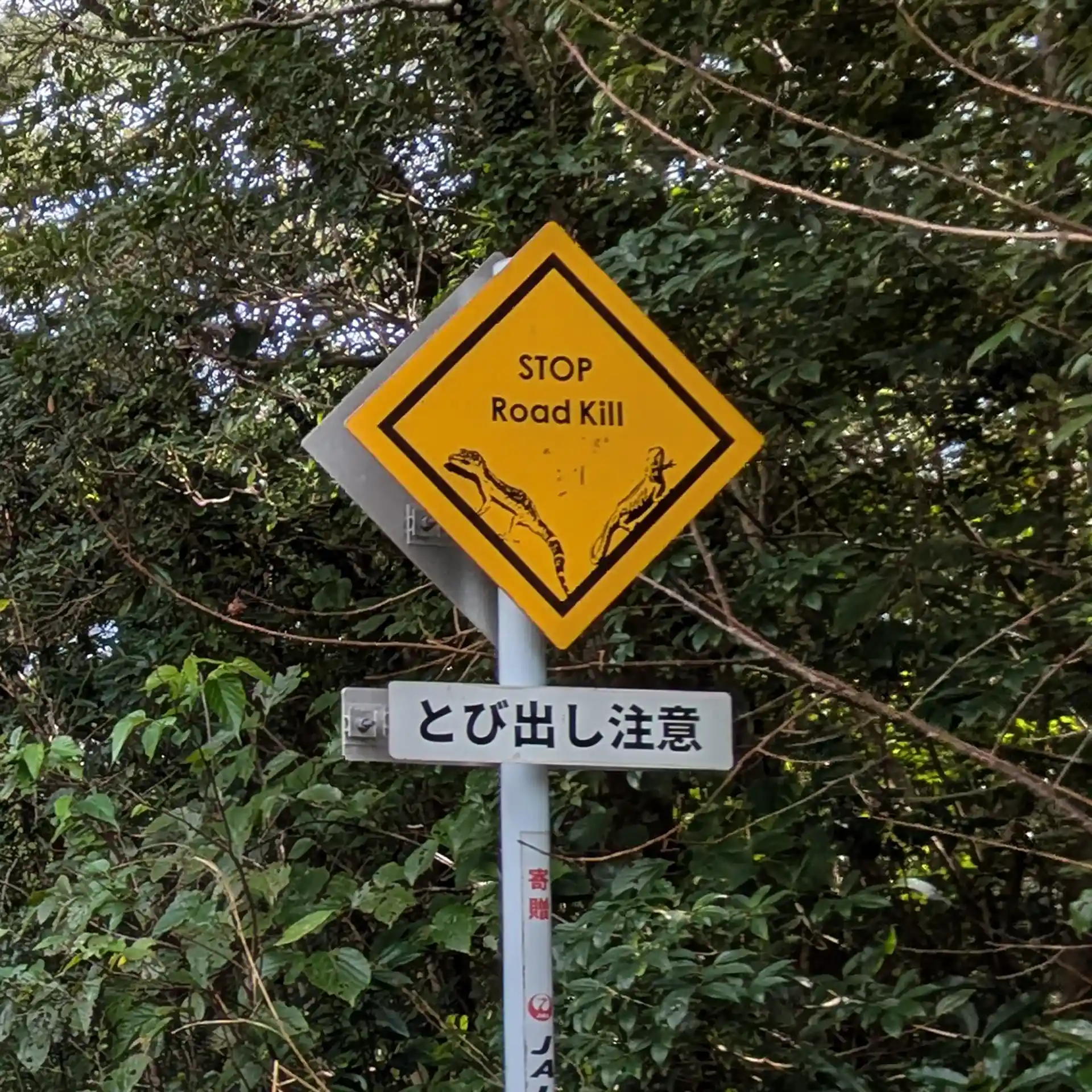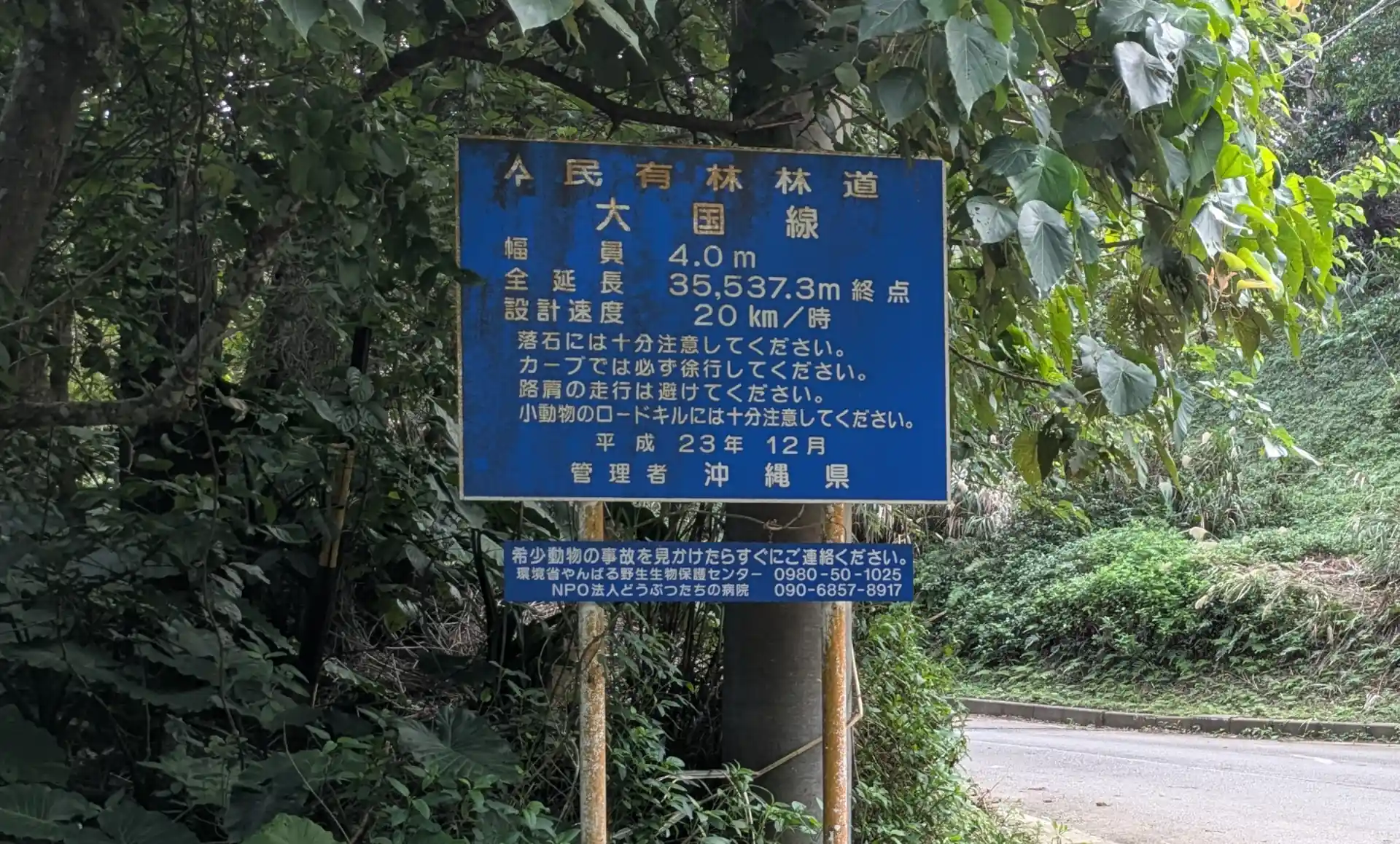 やんばる(山原)地域には、沖縄固有の希少動物がたくさん生息してる。動物たちは道路を横断することもあり、下図のように警戒標識が私たち道路使用者に注意を促していた。