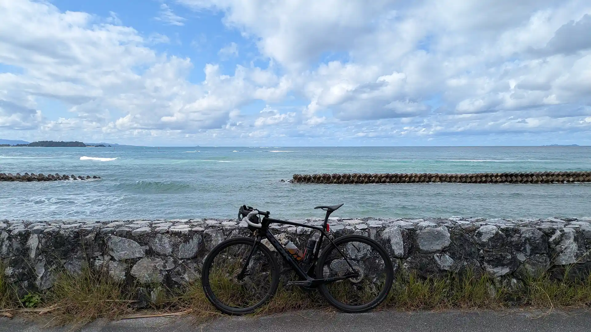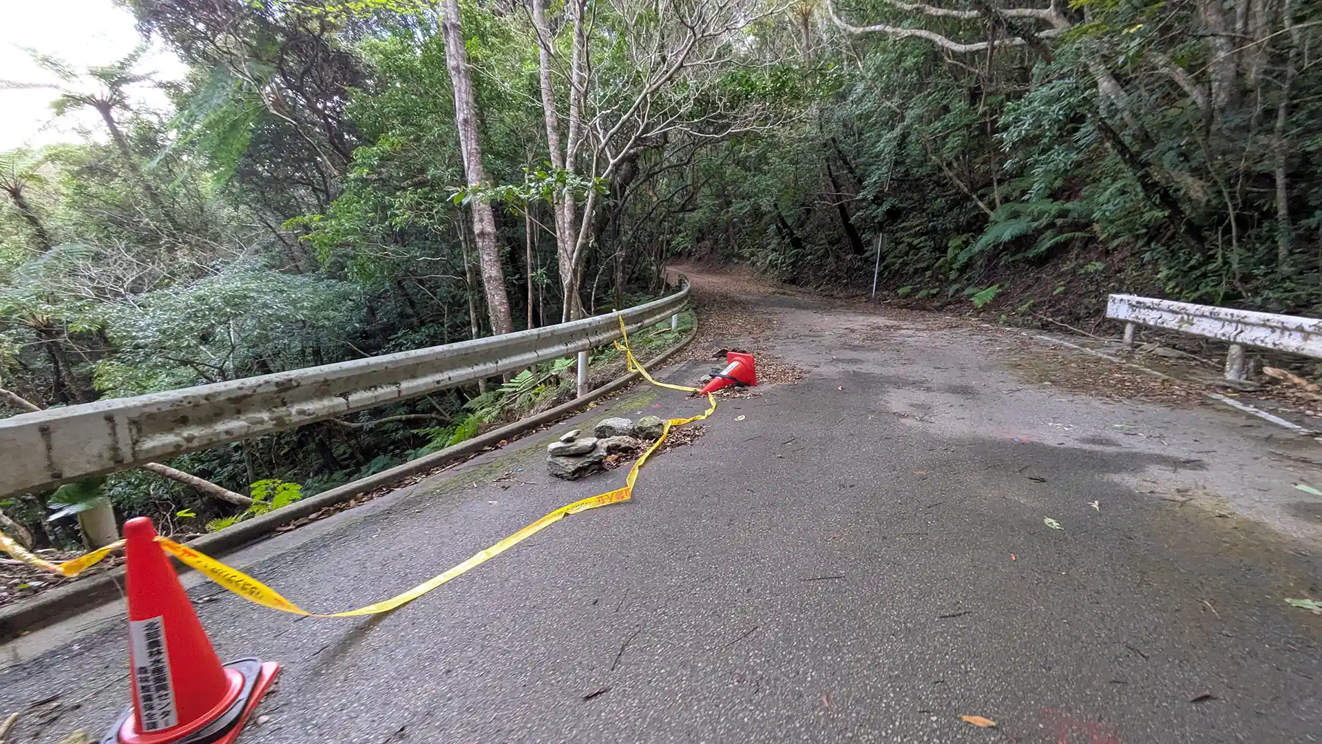 起点から7.5km地点のあたりにコーンが置かれていた。問題なさそうに見えたが、恐らくアスファルトの谷側は地面が無いのだろう。山側を通行した。