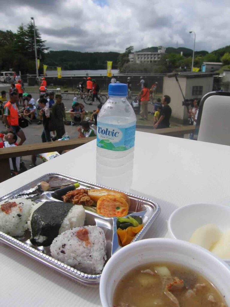 78.8km地点、亀山湖のエイドステーションに到着。落車のことなどを話ながら、疲れもあって言葉少な目に食事をとった。