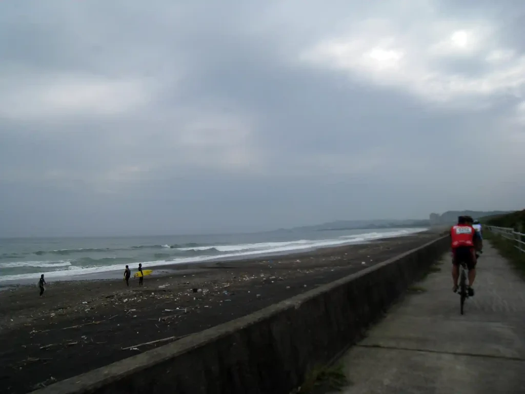 九十九里海岸を南下してるとやはり雨が落ちてきた。冷たい雨ではなかったけれど、途中の信号ストップでウインドブレーカーを着込んだ(雨具はこれだけ)。