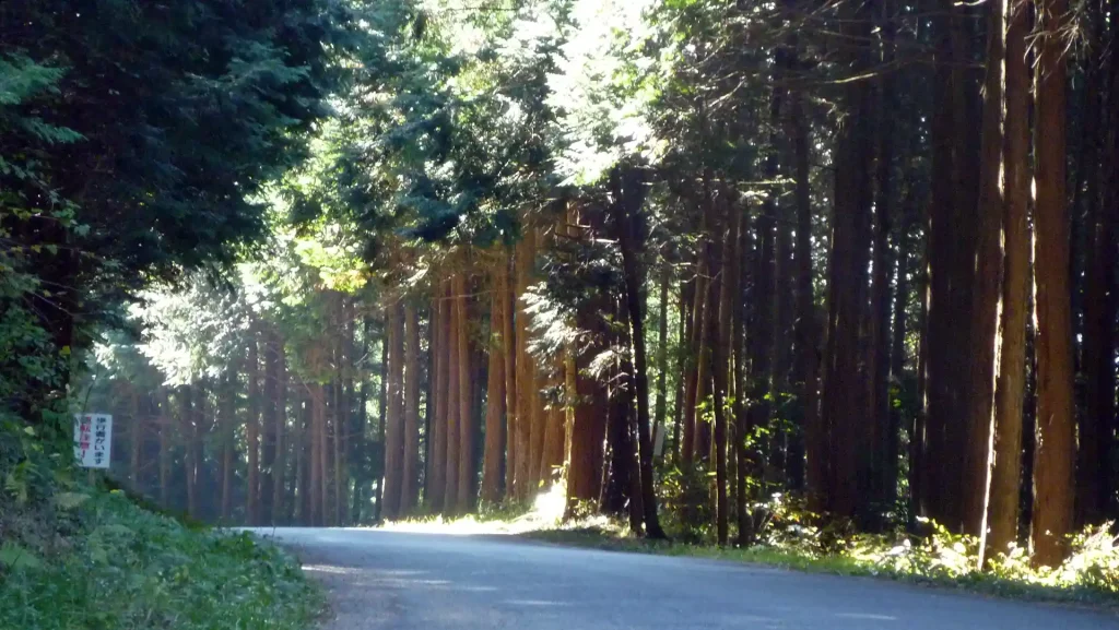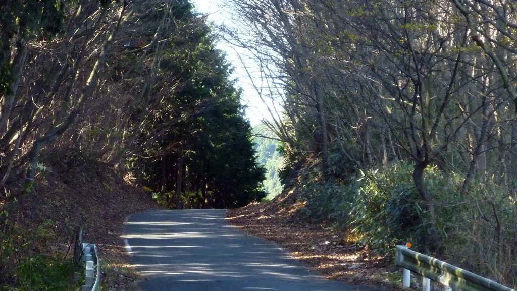 山の尾根をつないだ峠道なのでとても明るい。杉の木が密生しているが、手入れされてるので光も風も良く通る。今回は北に向かって走ったので、背後からの太陽光が体を暖めてくれた。