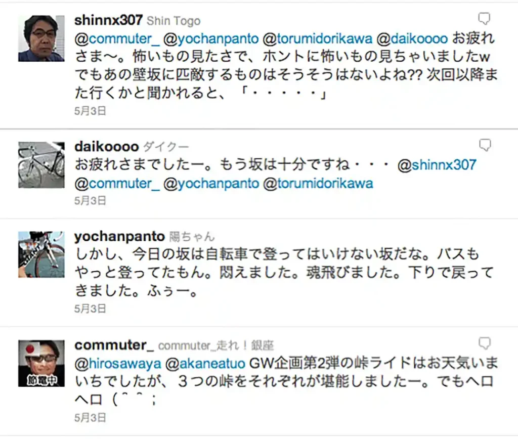 各自無事に自宅に帰着していることを知らせるためにツイート。そこに大体その日のライドに対する素直な感想が表れるので転載しておく(笑)