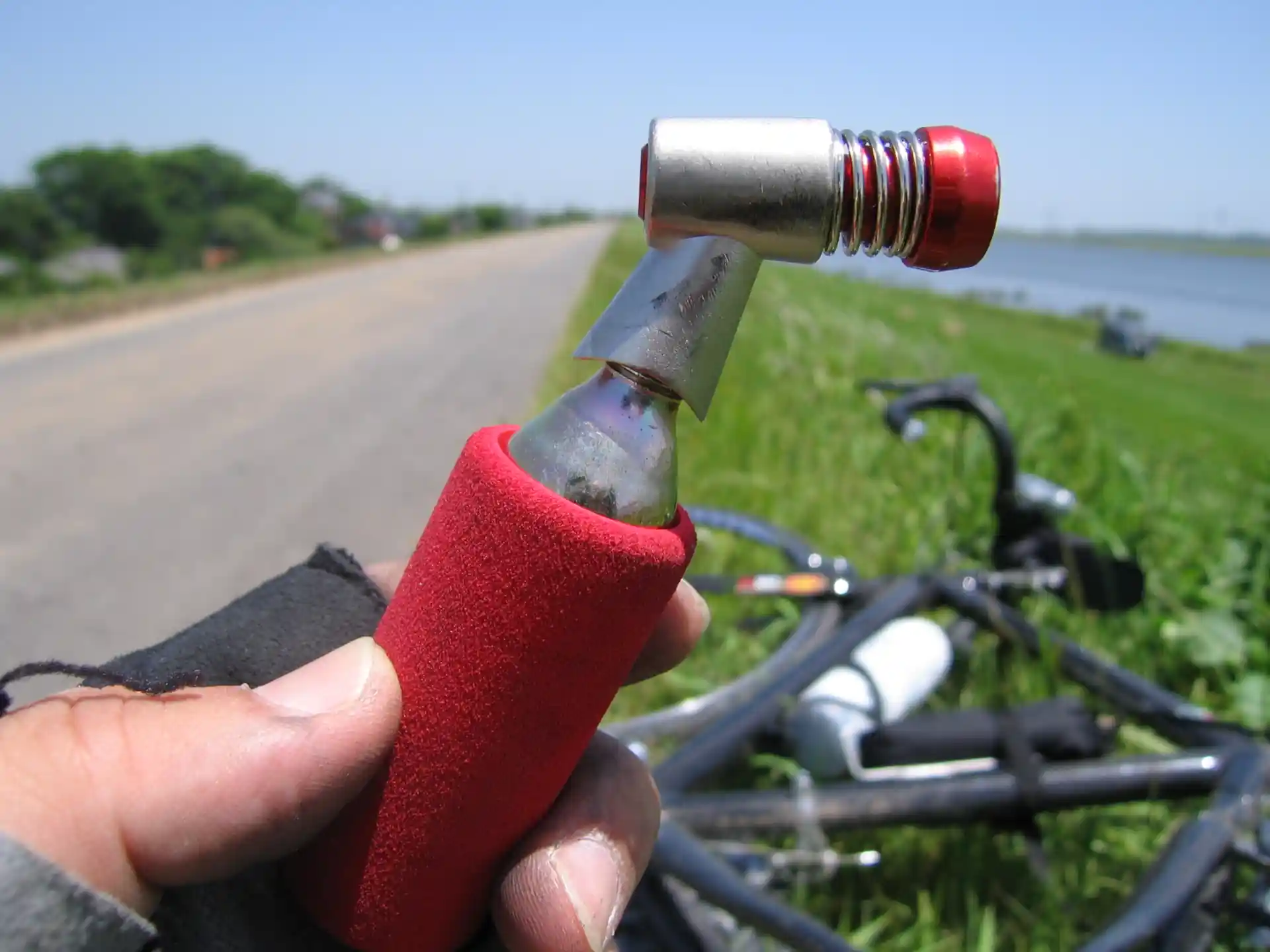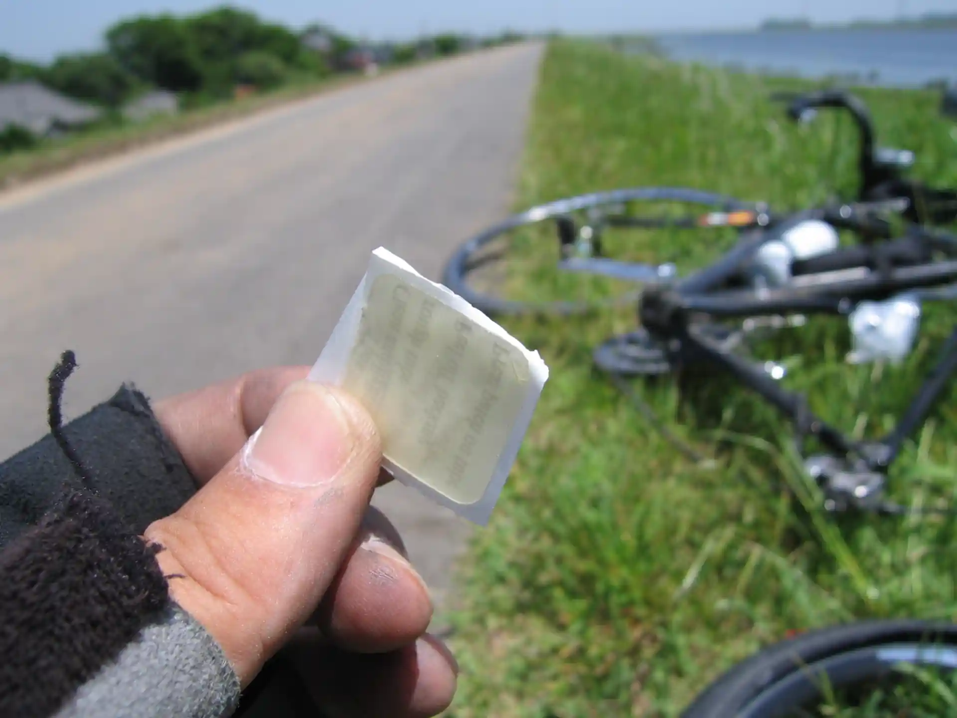 でも、心配はない。前日なるしまフレンドで買ったパッチや新しいチューブ、CO2ボンベがある。タイヤを外して、新しいチューブを装着して空気を入れれば、再び走りだせるはず(だった)。