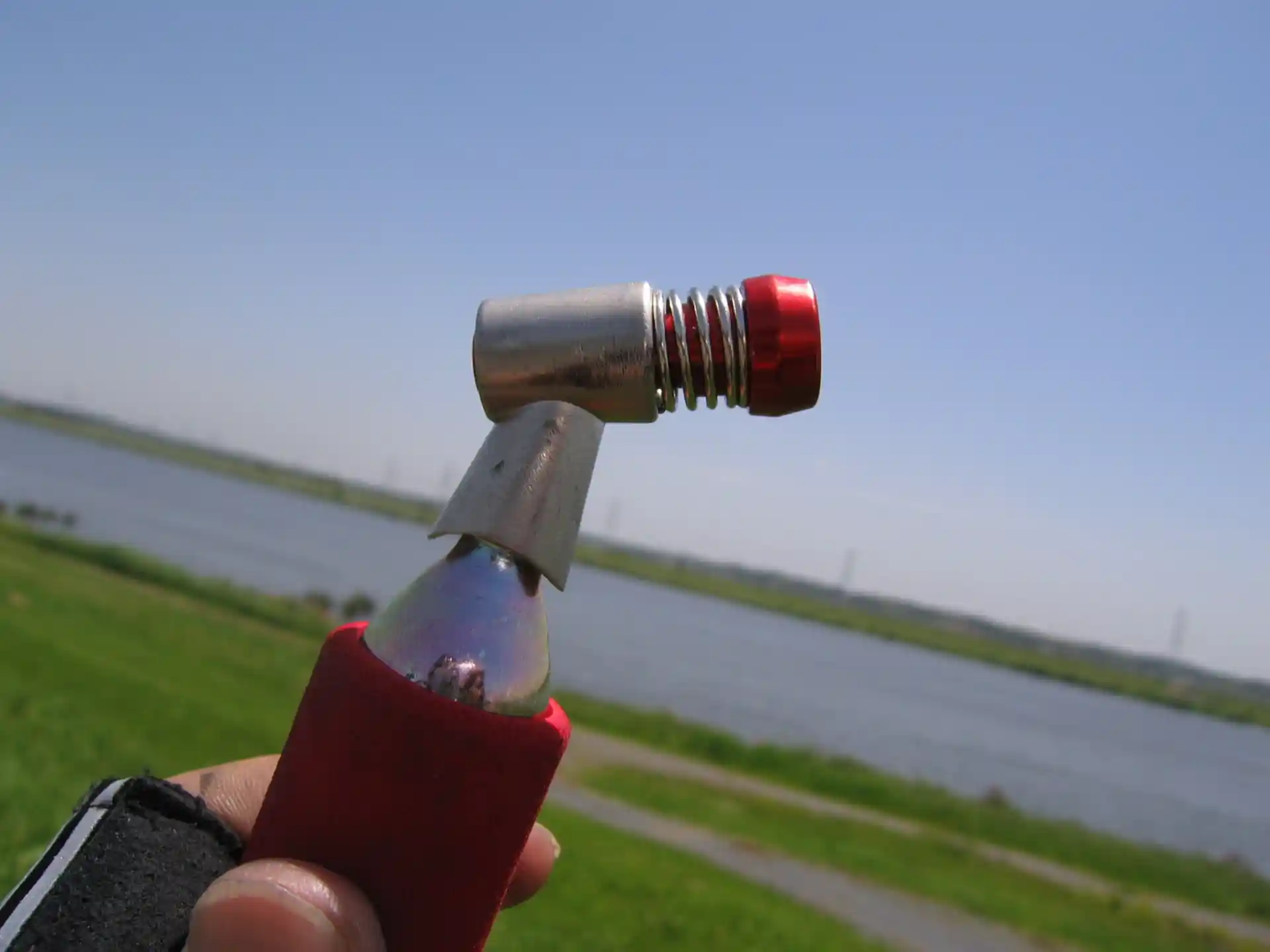 さて、パンク修理。持参した新しいチューブが捻れずタイヤに収まったのを確認して、バルブにボンベを押し付けた。