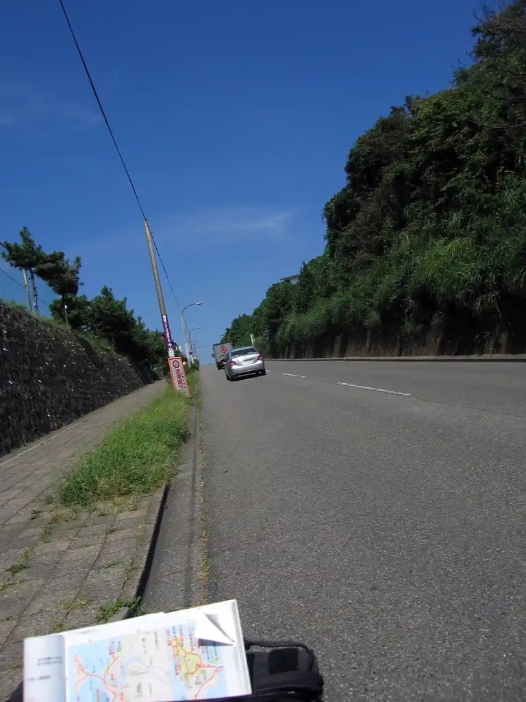 江の島から稲村ケ崎への国道134号線は、海岸沿いの僅かな場所に道路が作られているので狭い。江ノ電の線路と歩道、車道と人やバイク、クルマがひしめき合っている。