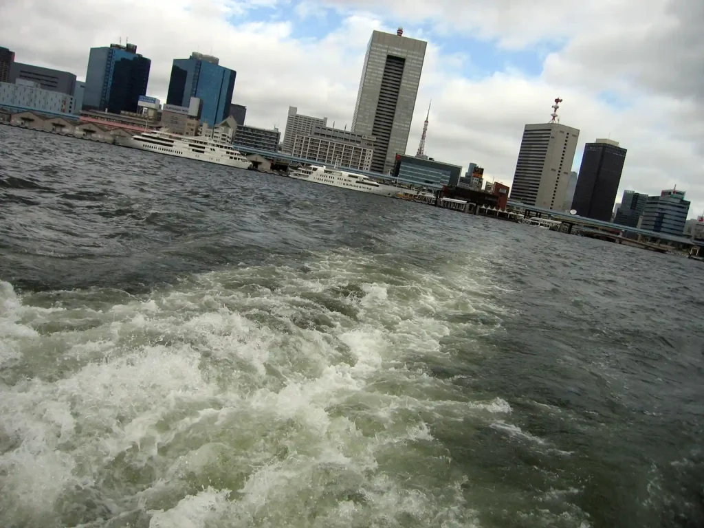 船上から日の出桟橋を見たアングル。東京タワーが見える。
